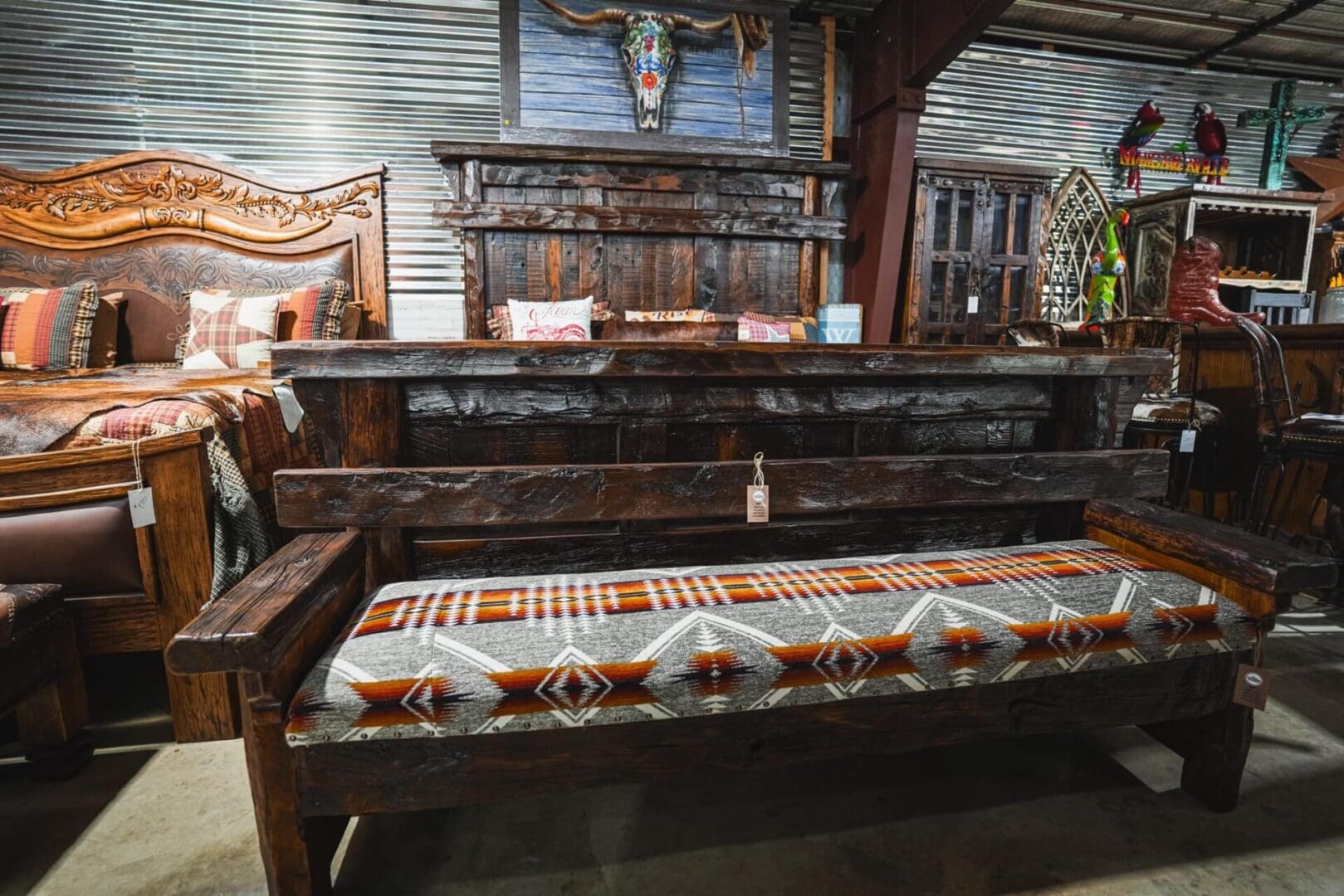 Experience the perfect blend of rustic charm and cultural flair with the stunning 84″ Old Wood Bench Aztec Print Bench. This exceptional piece boasts a distressed, old wood frame and a vibrant, Aztec-inspired print upholstery that adds a touch of warmth and personality to any room.