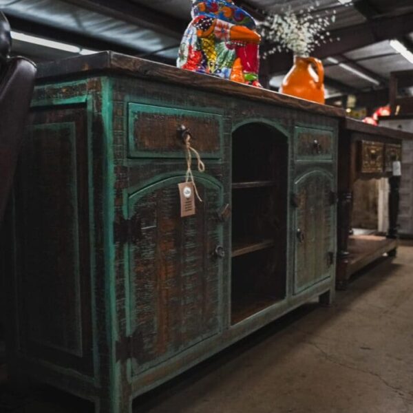 Elevate your home decor with the stunning La Turquesa 60″ Console. This exceptional piece boasts a unique, distressed turquoise finish that adds a touch of warmth and personality to any room.